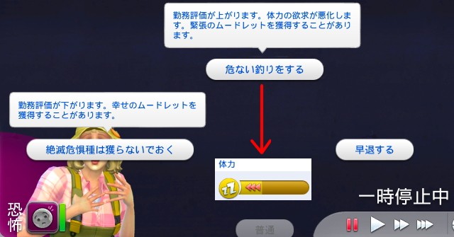 それまでは「危ない釣りをする」をさせていたので、そうすると、帰宅するころには体力ゲージが真っ赤になり、「危険な釣り」の緊張ムードをつけていたんですよね。