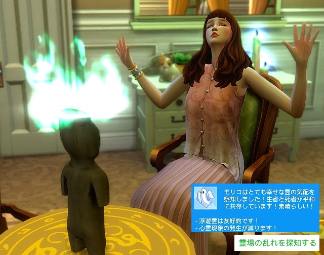 降霊テーブルを寝室に移動したのは、今まではキッチンに設置していて、モリコたちが料理を作ると、その流れで降霊テーブルでご飯を食べたりしていたので、それはちょっと・・・と思い、今まで降霊テーブルのあった場所にはちゃんと食事してもいいように似たような丸テーブルを用意して、それで降霊テーブルはモリコたちの寝室に持ってきたんですね。