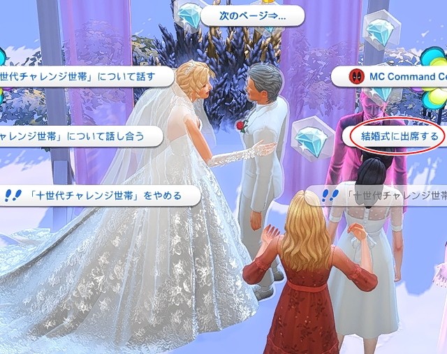ぞろぞろと集まってくるので、その中から、誰かひとりを選んで、そのシムをクリックすると「誰かに目がけてブーケトスをする」の選択肢があるので、それを実行するとブーケトスが実行されます。