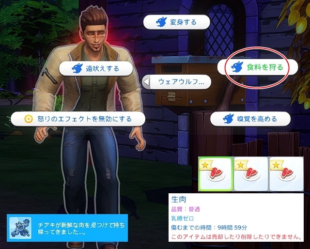 これを実行すると、ラビットホール形式で狩りに出掛け、帰宅するとシムの所持品に3皿「生肉」が入っていました。