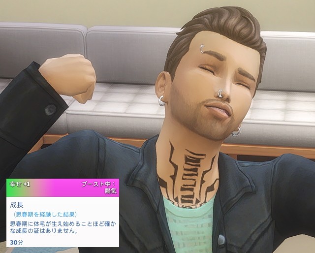 純平が辛そうな表情をしていたので、どうしたのだろうとムードを確認してみたら「うんざり」の不快ムードがついていて(アイコンは病気のアイコンでした)、どうやらソシャバの投稿が影響しているみたいでした。