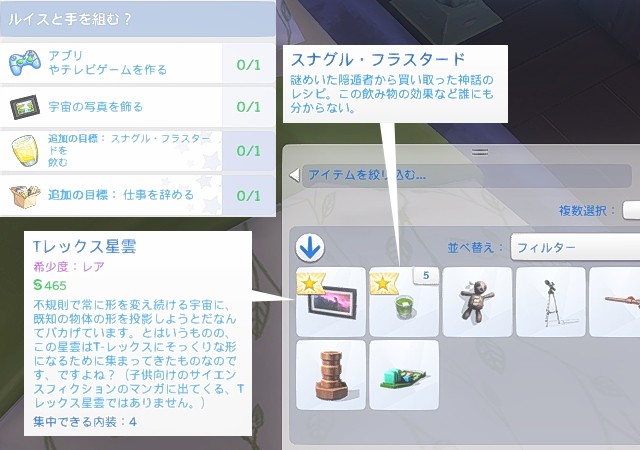 シナリオクリアにならなかったバージョンでは、恋愛系のタスクがいっさい現れず、最終的な目標は「アプリやテレビゲームを作る」「プログラミングスキルでレベル9に達する」「スナグル・フラスタードが有効時にプログラミングをする」「仕事を辞める」の4つになり、これらすべてをクリアしているのにシナリオは終わらず、かと言って、これ以上の新しいタスクも表れず・・・という感じでした。