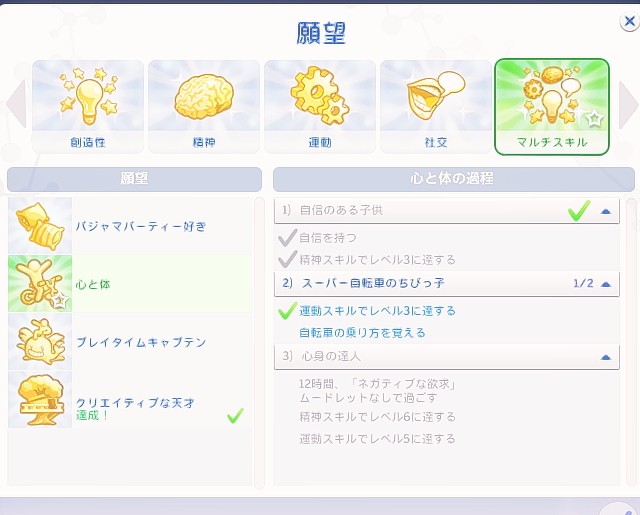 こうして『クリエイティブな天才』を達成しましたので、前回自転車乗りの練習をしたものの、1回の練習では乗れるようにならなかったので、「自転車の乗り方を覚える」という項目のある『心と体』に挑戦することにします!