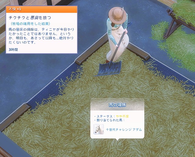 あとね、この区画には最初からお馬さん用の訓練用アイテムが2種類設置してあって、それを残したままお家を建築したのですが(追記です:あとで確認したら、デフォだと訓練用アイテムはありませんでした^^;)、アダムが訓練用アイテムを自律で使ってくれることはどうやらないようだったので、私がアダムを操作して、ホースジャンプをやらせてみました。
